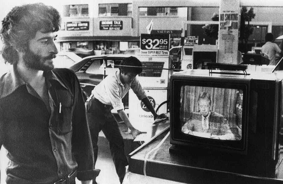 Employees at a gas station in Los Angeles watch President Jimmy Carter giving his energy speech over national television on July 15, 1979